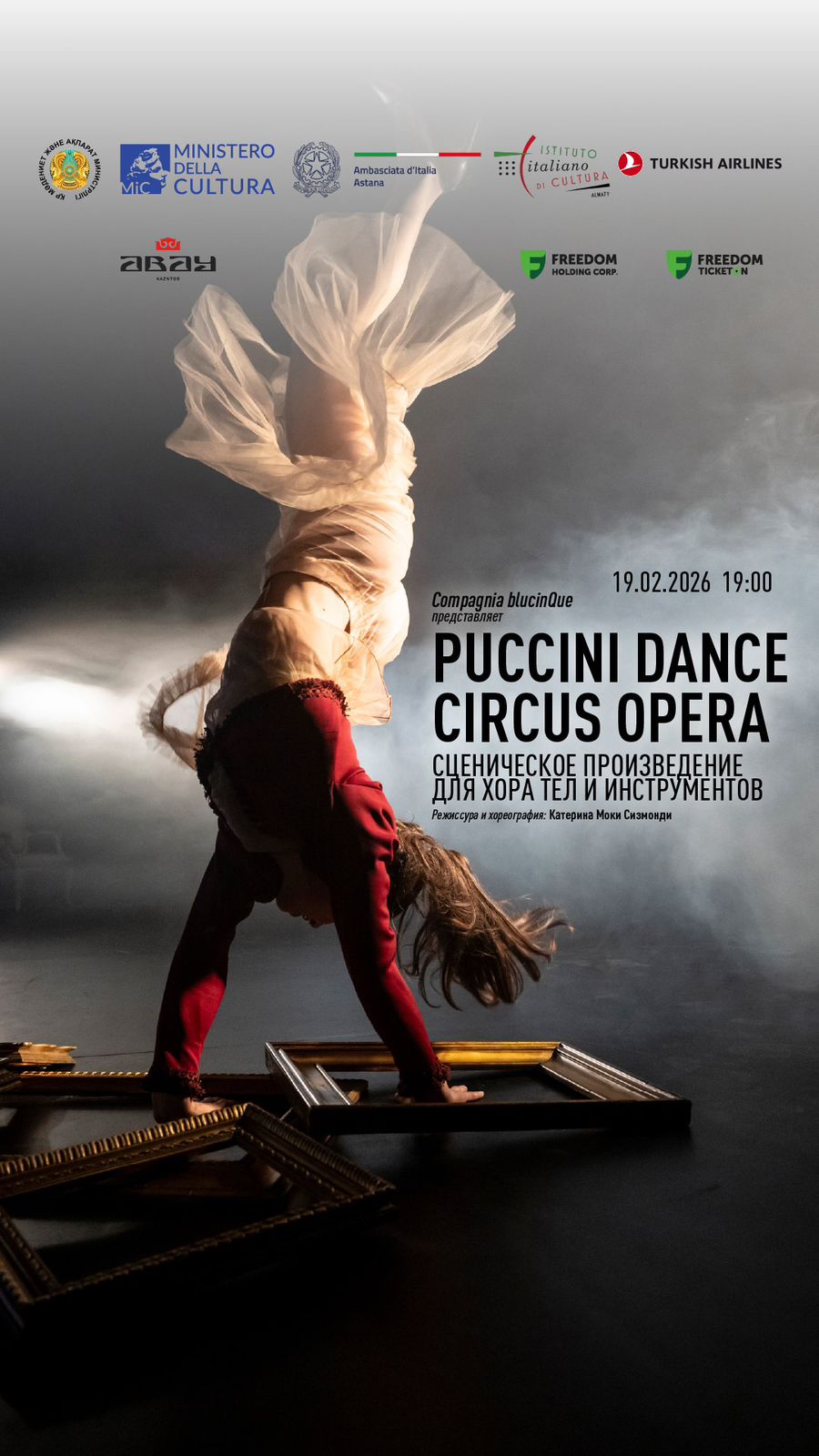 Puccini Dance Circus Opera — это спектакль создан итальянской компанией blucinQue и ORT — Оркестра Тосканы. В алматинских показах примут участие также местные артисты, оркестр и вокалисты, что подчеркивает характер культурного диалога между Италией и Казахстаном.